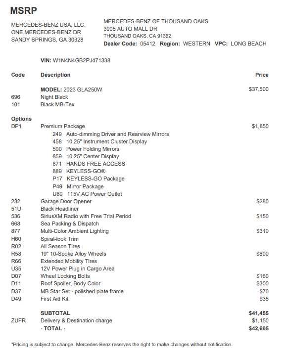 PREMIUM PACKAGE Hands-Free Access, Power Folding Mirrors, 10.25 Digital Instrument Cluster, Auto Dimming Rearview & Drivers Side Mirrors, Keyless GO®, 115V Outlet, 10.25 Media Display w/Touchscreen, WHEELS: 19 10-SPOKE W/MATTE BLACK ACCENTS Tires: 235/50R19, All-Season Tires, MOE Tires (Extended Mobility), BODY COLOR ROOF SPOILER, GARAGE DOOR OPENER, Power Liftgate, Back-Up Camera, Turbocharged, iPod/MP3 Input, Onboard Communications System Exchange Privilege for 7 days or 500 miles, whichever comes first, Each Certified vehicle must pass a rigorous inspection of over 165 points, 24-Hour Roadside Assistance includes trip routing, trip interruption coverage and technical help, A network of over 300 Mercedes-Benz dealers will support your Certified Mercedes-Benz, Carfax Vehicle History Report, Balance of New Car Warranty plus 1 year/unlimited miles extended Limited Warranty Mercedes-Benz of Thousand Oaks is your local Mercedes-Benz dealership, serving the Thousand Oaks and Los Angeles Metro area since 1982. Our showroom always includes the most current luxurious and sophisticated Mercedes-Benz models. Were only a short trip from many communities, including Malibu and Simi Valley, and our team is happy to provide sales, financing, and automotive service and repair on site.
