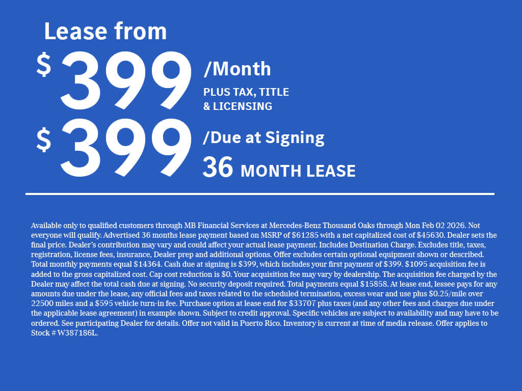 FIRST AID KIT, Panoramic Roof, Full-Time All-Wheel, Power Liftgate, Heated Driver Seat, Back-Up Camera Exchange Privilege for 7 days or 500 miles, whichever comes first, Each Certified vehicle must pass a rigorous inspection of over 165 points, 24-Hour Roadside Assistance includes trip routing, trip interruption coverage and technical help, A network of over 300 Mercedes-Benz dealers will support your Certified Mercedes-Benz, Carfax Vehicle History Report, Balance of New Car Warranty plus 1 year/unlimited miles extended Limited Warranty Mercedes-Benz of Thousand Oaks is your local Mercedes-Benz dealership, serving the Thousand Oaks and Los Angeles Metro area since 1982. Our showroom always includes the most current luxurious and sophisticated Mercedes-Benz models. Were only a short trip from many communities, including Malibu and Simi Valley, and our team is happy to provide sales, financing, and automotive service and repair on site.